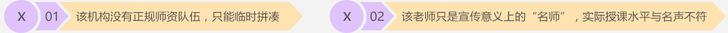 現在許多培訓機構存在這樣一種貓膩:以一線名師進行宣傳,給學員營造出名師全程授課的錯覺,而實際上這些名師只是單純發揮宣傳作用,實際授課教師往往是“三弱”教師(經驗弱、實力弱、成效弱),或者名師只是象征性來講一次課,之后就再無蹤影。