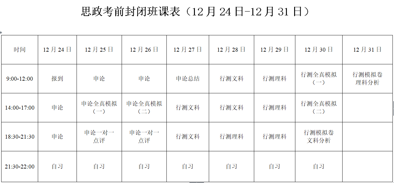 1.2017年12月24日10:00-12:00報到,入住封閉營地,辦理手續、領取物品,基本學習準備;