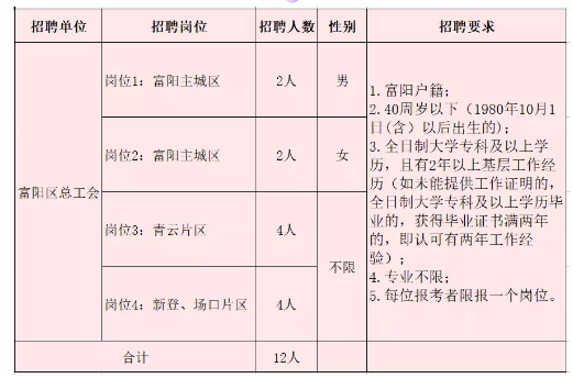工會工作者招聘工作由省總工會統(tǒng)一組織,按照《浙江省社會化職業(yè)化工會工作者管理辦法》、《浙江省社會化職業(yè)化工會工作者招聘實施細則》的規(guī)定進行。根據(jù)工會工作需要,區(qū)總工會現(xiàn)面向社會公開招聘社會化職業(yè)化工會工作者12名,具體招聘崗位和名額如下: