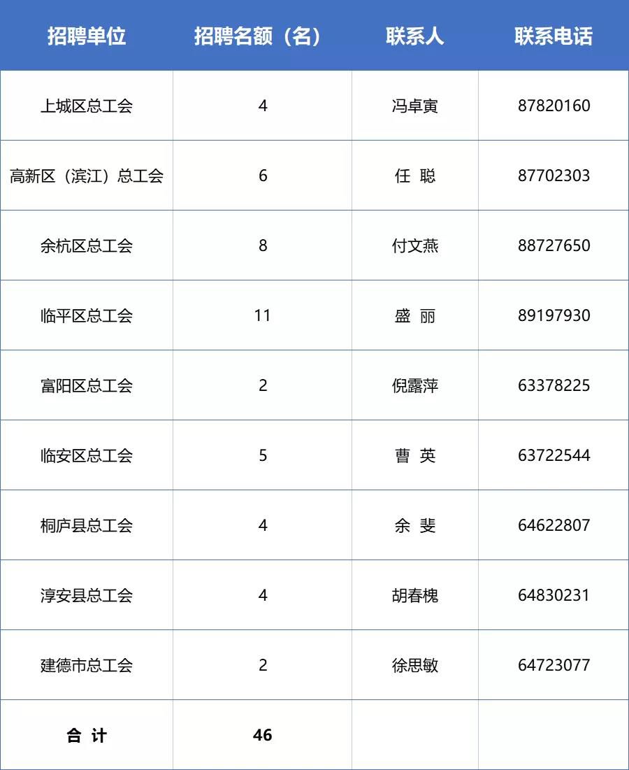 根據工會工作需要,今年我市共招聘社會化職業化工會工作者46名,具體招聘單位和名額如下:
