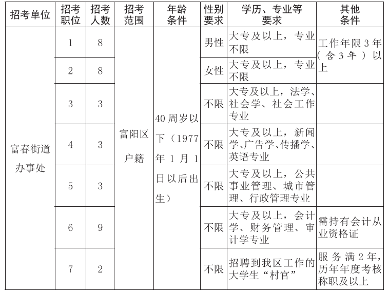 附:2017年杭州市富陽區富春街道公開招聘社區工作人員需求計劃一覽表